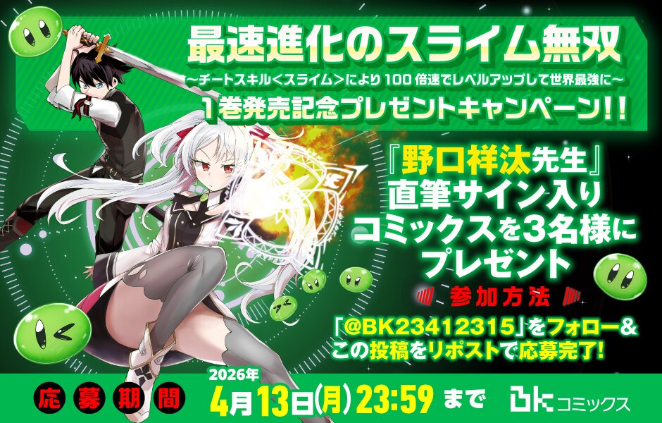 4月3日(金)に発売された『最速進化のスライム無双~チートスキル<スライム>により100倍速でレベルアップして世界最強に~1』野口祥汰先生の直筆サイン入りコミックスを抽選で3名様にプレゼントいたします♪